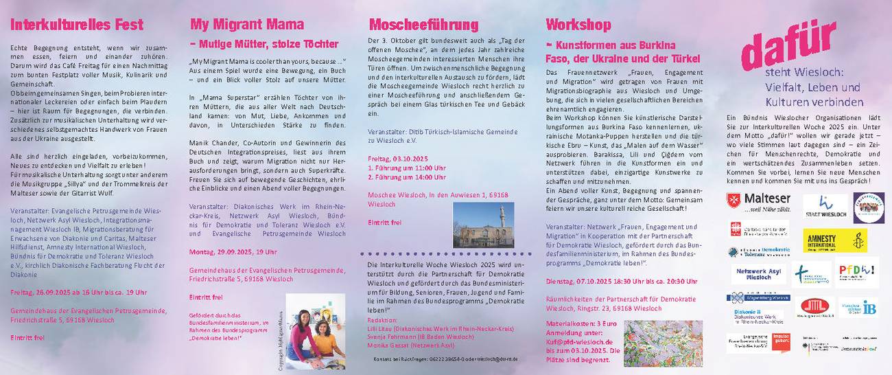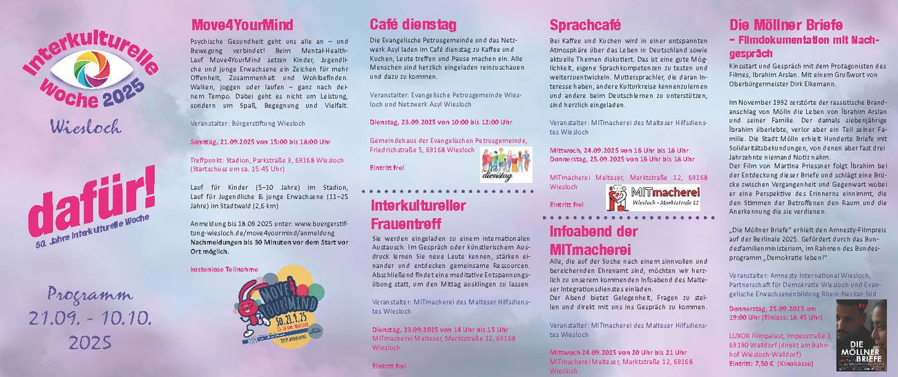 Ein Bündnis Wieslocher Organisationen lädt Sie zur Interkulturellen Woche 2025 ein. Unter dem Motto „dafür!“ wollen wir gerade jetzt – wo viele Stimmen laut dagegen sind – ein Zeichen für Menschenrechte, Demokratie und ein wertschätzendes Zusammenleben setzen.