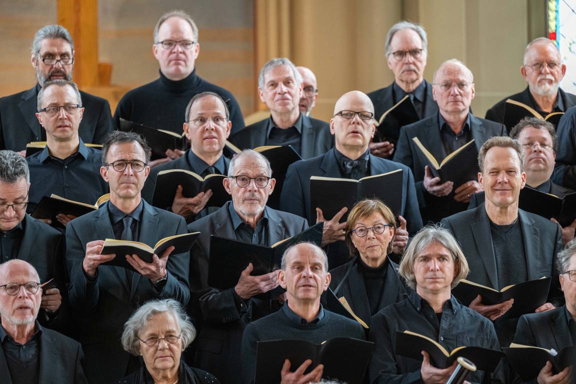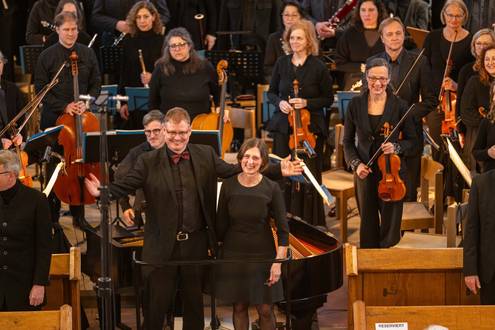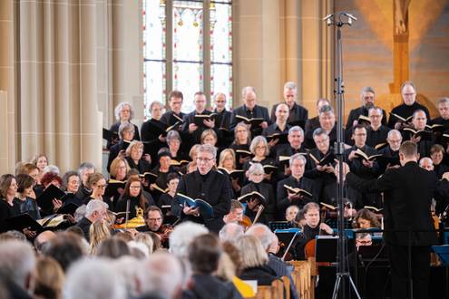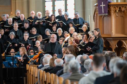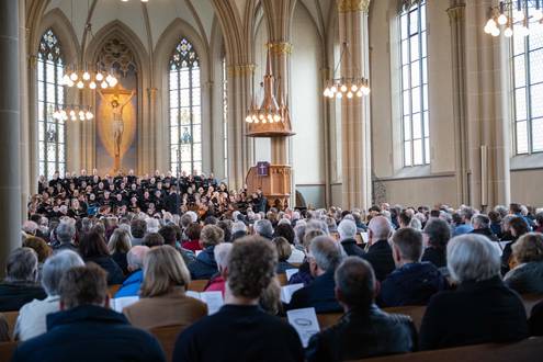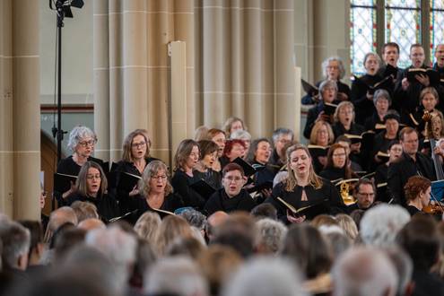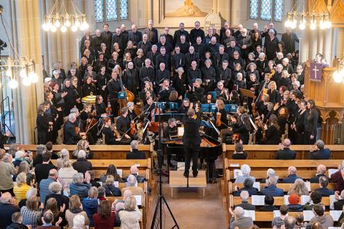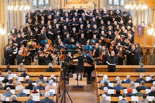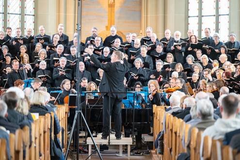 Bei der Einführung in das Werk am 20. März hatte Professor Bernd Stegmann die Matthäus-Passion als „Mount Everest der Kirchenmusik“ bezeichnet. Im wahrsten Sinne war es ein Kraftakt aller Beteiligten, umso schöner war es, nach Monaten der Planung, Vorbereitung und Proben endlich zum Konzert zu kommen. Die Kirche war bis auf den letzten Platz besetzt, und auf den Podesten im Altarraum drängten sich etwa 100 Sängerinnen und Sänger, die das Orchester umringten, das den Chor und die Solisten professionell begleitete.
